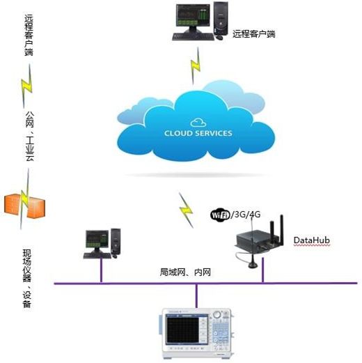 解決方案:無人值守站中的 示波記錄儀接入 DataHub,通過 DataHub 實時把示波記錄儀的數(shù)據(jù)傳輸?shù)焦W(wǎng)云中。用戶在辦公室可以隨時訪問公網(wǎng)云中的 DL850E 的數(shù)據(jù)。