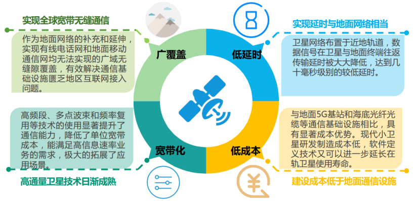 同5G相比,衛(wèi)星互聯(lián)網(wǎng)具有廣覆蓋、低時(shí)延、寬帶化、低成本的特點(diǎn),可解決現(xiàn)有世界上超30億人無法使用互聯(lián)網(wǎng),70% 地理空間未實(shí)現(xiàn)互聯(lián)網(wǎng)覆蓋的問題,與5G網(wǎng)絡(luò)形成互補(bǔ),形成無縫銜接的通信網(wǎng)絡(luò)。