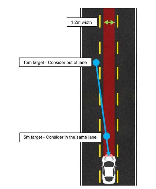 其次,將VUT雷達(dá)與AREG前端位置對(duì)準(zhǔn)在硬件搭建過程中是非常重要的。因?yàn)橹挥羞@樣才能使模擬車輛(RV)處于VUT正前方,實(shí)現(xiàn)零角度偏差。通常,如果RV距離車道中心不超過1.2米,VUT會(huì)認(rèn)為與RV處于同一車道上。在近距離的情況下,即便存在角度的偏差也不會(huì)對(duì)VUT對(duì)RV的識(shí)別造成影響,而如果在較遠(yuǎn)的距離,RV很多可能會(huì)被VUT檢測(cè)為偏離車道。參見圖5。在這種情況下,由于角度未對(duì)準(zhǔn),RV車輛在前方15米減速時(shí),并沒有引起VUT的響應(yīng)。但是當(dāng)AREG的目標(biāo)距離改為5米時(shí),儀表盤上突然出現(xiàn)一個(gè)目標(biāo),導(dǎo)致VUT突然剎車。