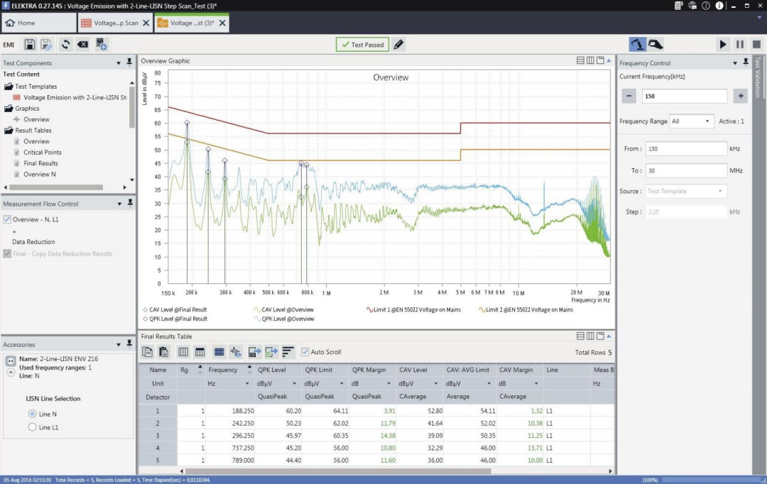 圖 2:電壓發(fā)射測(cè)量的配置。測(cè)量設(shè)置、頻率范圍、限值和附件整齊地組合在一起。