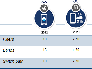 圖2 5G手機(jī)所需的濾波器和通道數(shù)量大幅度增加