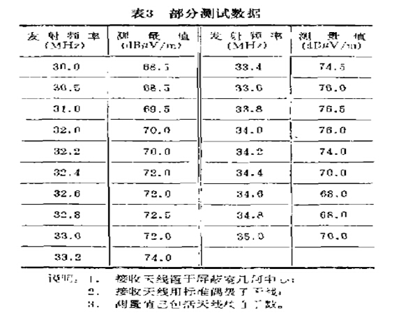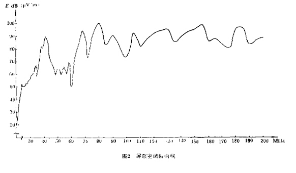 為了掌握實際使用情況,在20-200MHz頻率范圍內(nèi),我們利用高靈敏度接收機進行了精確測試。測試曲線如圖2所示,部分測試數(shù)據(jù)(第一諧振峰附近)在表3中給出。
