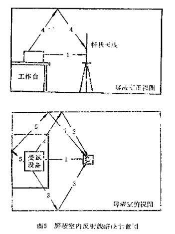 屏蔽室內(nèi)因存在激勵源而引起的另物理現(xiàn)象是電磁波的反射。在對受試設(shè)備進行輻射發(fā)射測試時,接收天線除了接受來自受試設(shè)備的直接輻射外,還有來自屏蔽室腔體表面(包括地面、天花板以及墻壁)的反射波,如圖5所示。