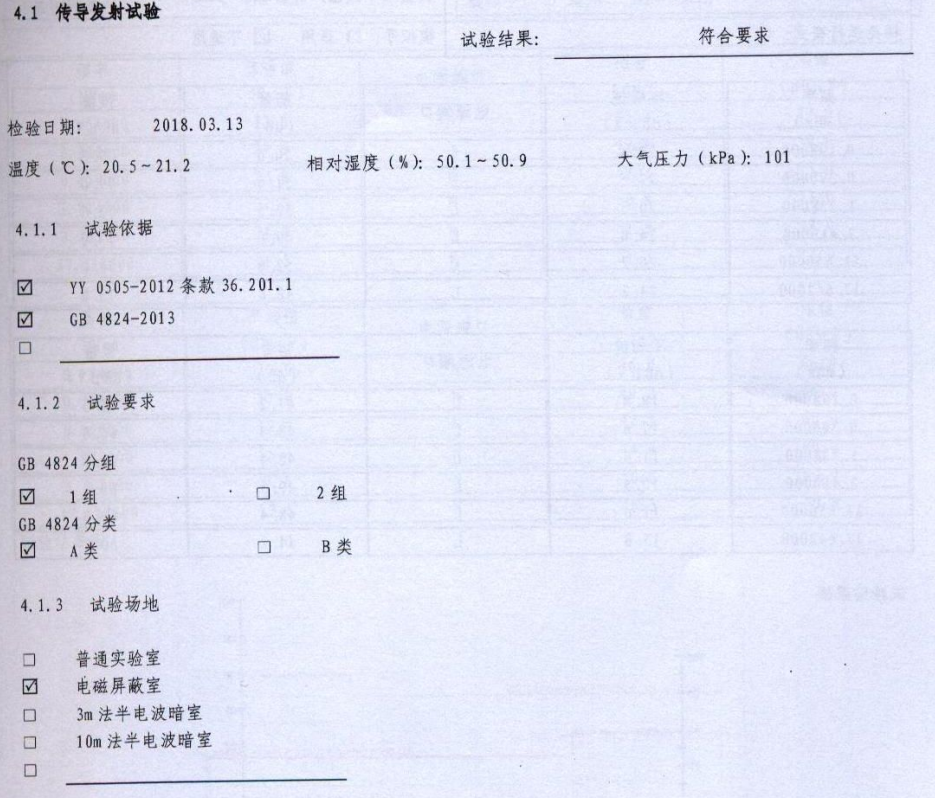 其次試驗(yàn)依據(jù)YY0505、GB4824-2013,按照我上面所講設(shè)備分組分類(lèi),劃分為1組(本為發(fā)揮自身功能的需要而有意產(chǎn)生和(或)使用傳導(dǎo)耦合射頻能量的所有工科醫(yī)設(shè)備)A類(lèi)(非家用和不直接連接到住宅低壓供電網(wǎng)設(shè)施中使用的設(shè)備),