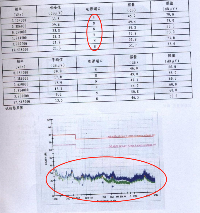 只進(jìn)行了電源端口測(cè)試:由上圖及測(cè)試表格可知電源端口L&N在不同頻率段的測(cè)量值都在相應(yīng)的限值范圍內(nèi),故該產(chǎn)品傳導(dǎo)發(fā)射測(cè)試合格。