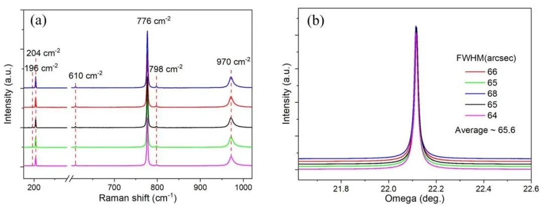 采用提拉式物理氣相傳輸法,聯(lián)合實(shí)驗(yàn)室成功生長(zhǎng)出直徑為6英寸(即150mm)的碳化硅單晶,其厚度突破了100mm。測(cè)試加工而得的襯底片的結(jié)果顯示,該超厚碳化硅單晶具有單一的4H晶型(圖2a)、結(jié)晶質(zhì)量良好(圖2b),電阻率平均值不超過(guò)~ 30 mΩ·cm。