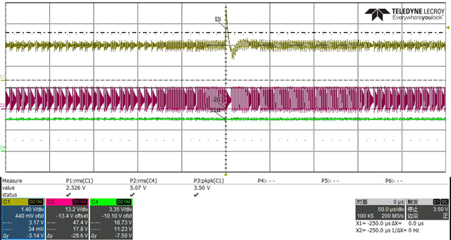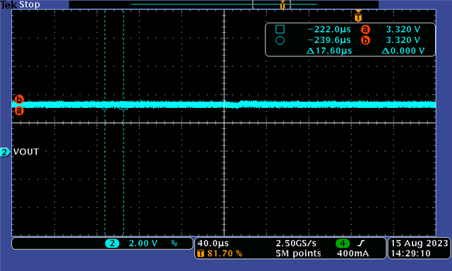 對此,如果需要在我們的EVM板上用熱電偶測試溫度,將R4/R5降低到51k/10.5k歐姆,同時添加一個1nF的X7R電容與R5并聯(lián)。測試之后表現(xiàn)出后端MCU不會再復(fù)位。研發(fā)工程師把輸出電壓改成3.3V,測得的波形如下??梢钥闯觯敵鲭妷篤out穩(wěn)定在3.3V,不會對后端MCU造成影響。