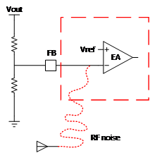 通過觀察圖四可以發(fā)現(xiàn),TPS54202的FB引腳的電壓由于持續(xù)性的巨大的射頻能量而被拉到0,從而導(dǎo)致芯片內(nèi)部不斷發(fā)脈沖,讓輸出電壓升高。分析FB引腳的特性和圖二的EVM板的原理圖和,F(xiàn)B引腳的內(nèi)部結(jié)構(gòu)是一個接收器,它很容易受到具有大量能量的耦合噪聲的干擾,圖二的C8也就是Cff(前饋電容), Cff作為低阻抗路徑,能將一對零極點引入回路,帶寬將會增加,帶寬增加容易引入更多的噪聲(如圖五)。